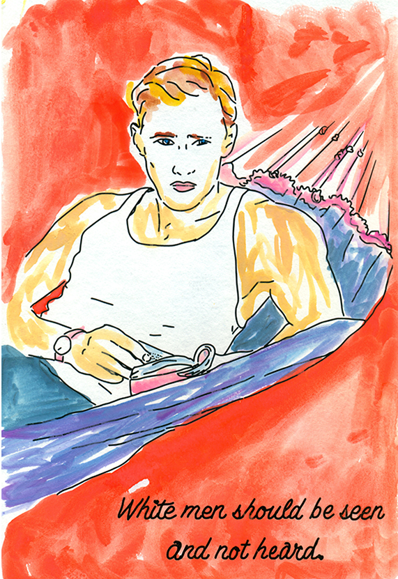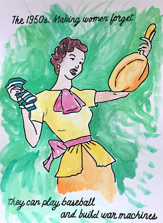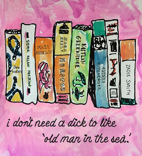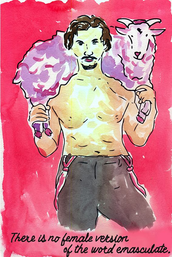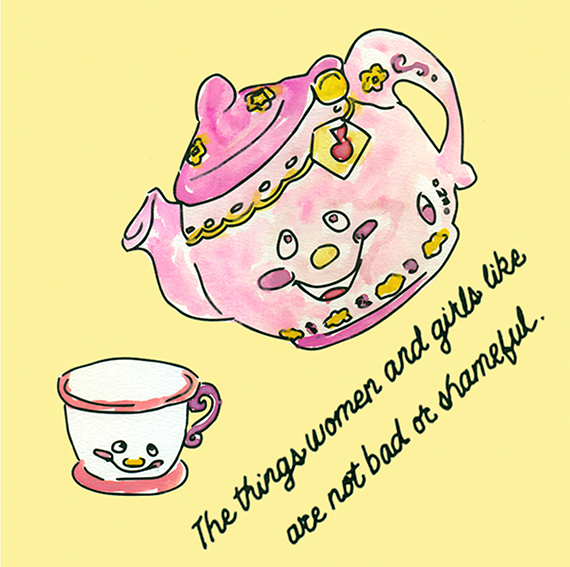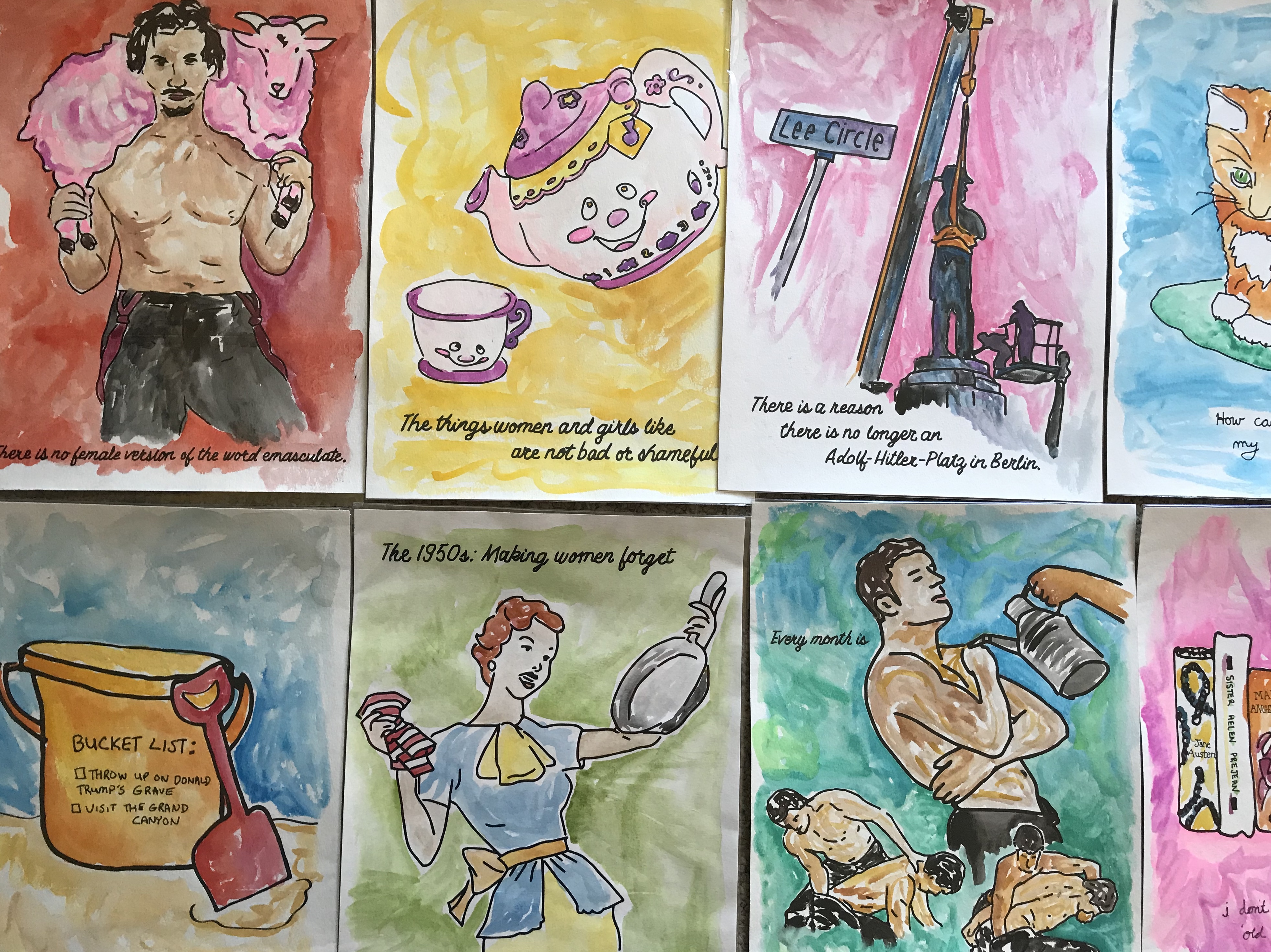 These are a series of feminist watercolors. The black line is printed on watercolor paper, and each print is hand painted by Kelsey.